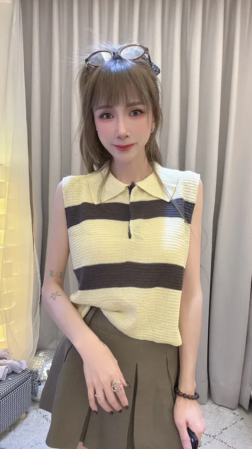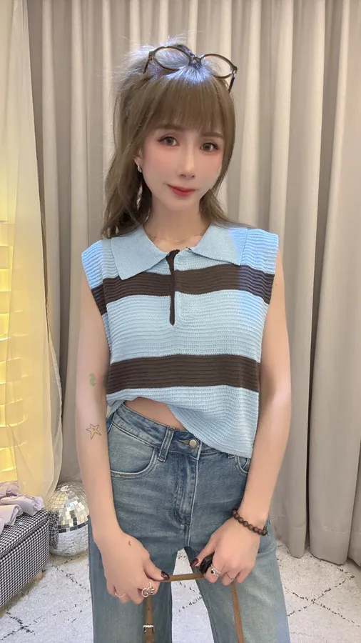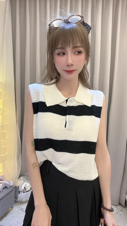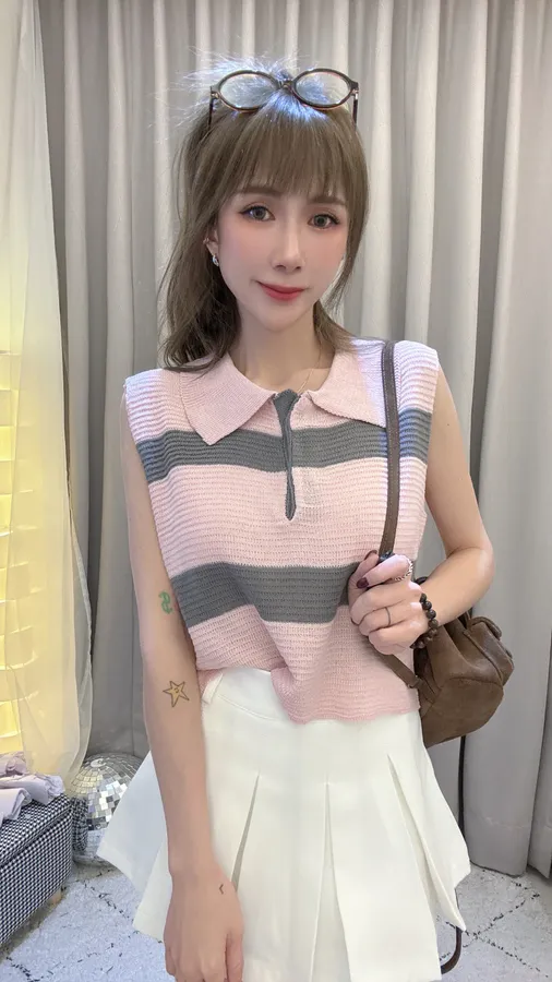 預購/翻領撞色條紋針織上衣