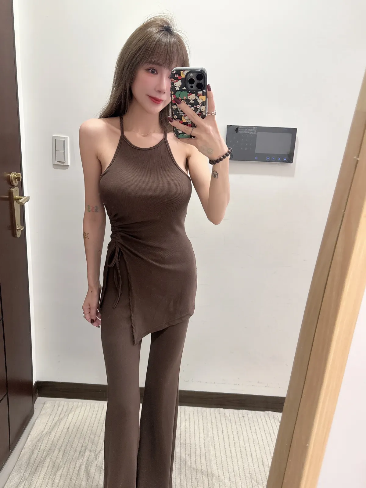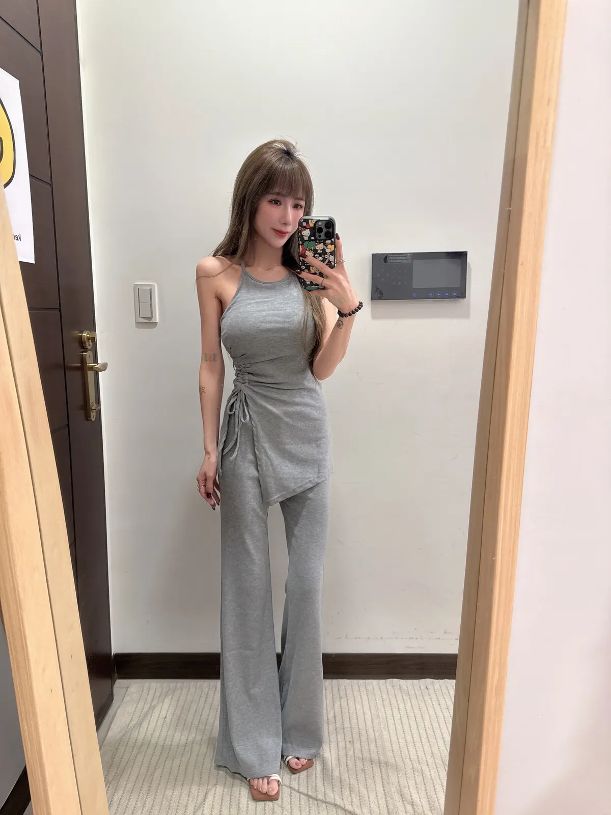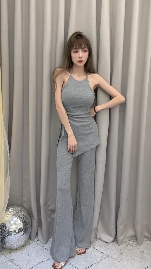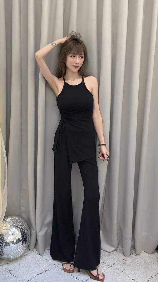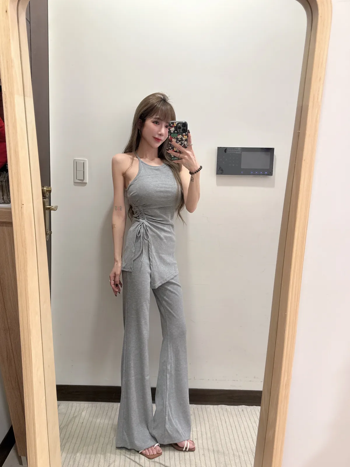 預購/訂製款削肩抓皺抽繩BRATOP喇叭褲套裝